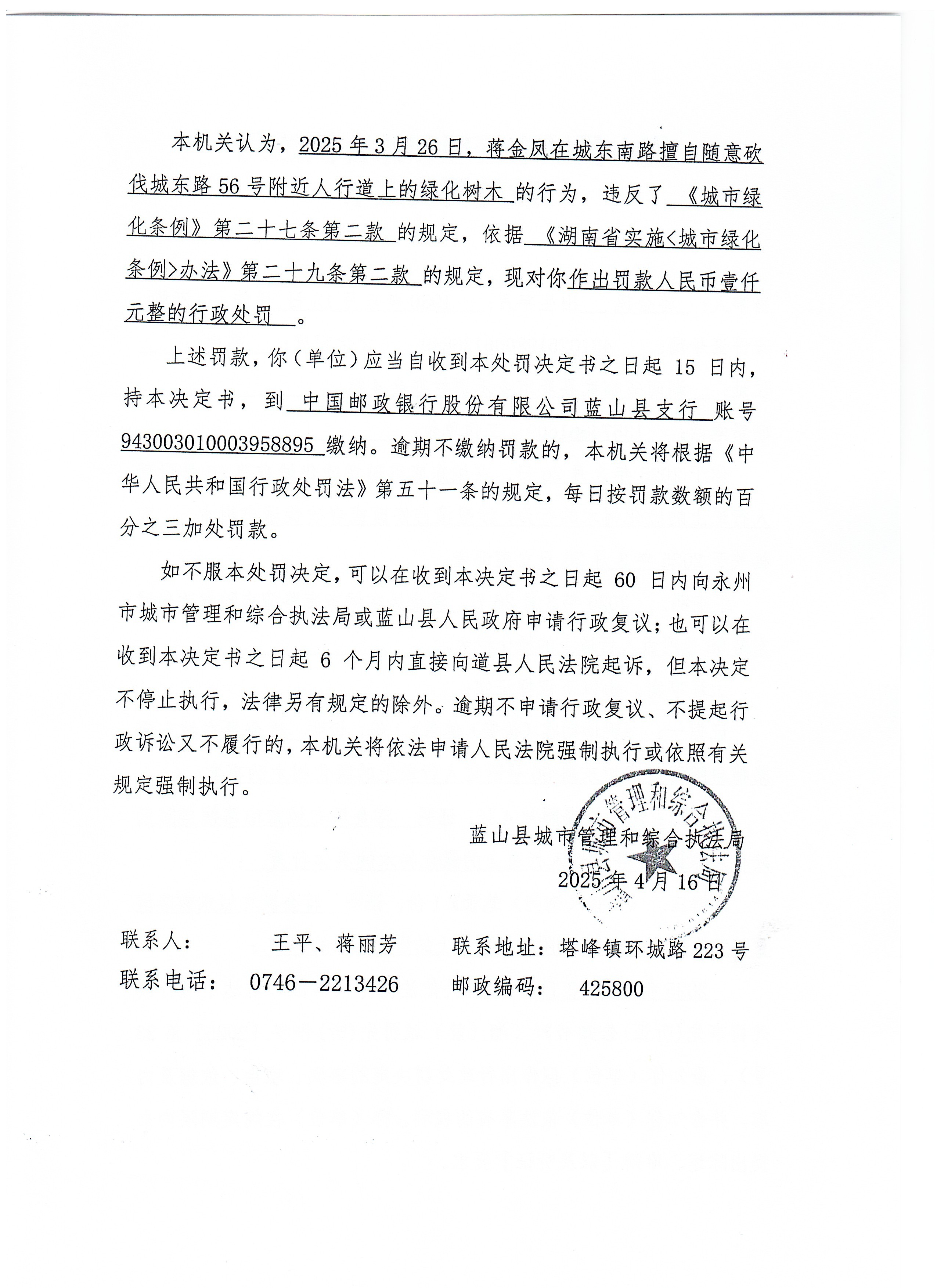 关于对蒋金凤擅自修剪或者砍伐城市树木的行政处罚