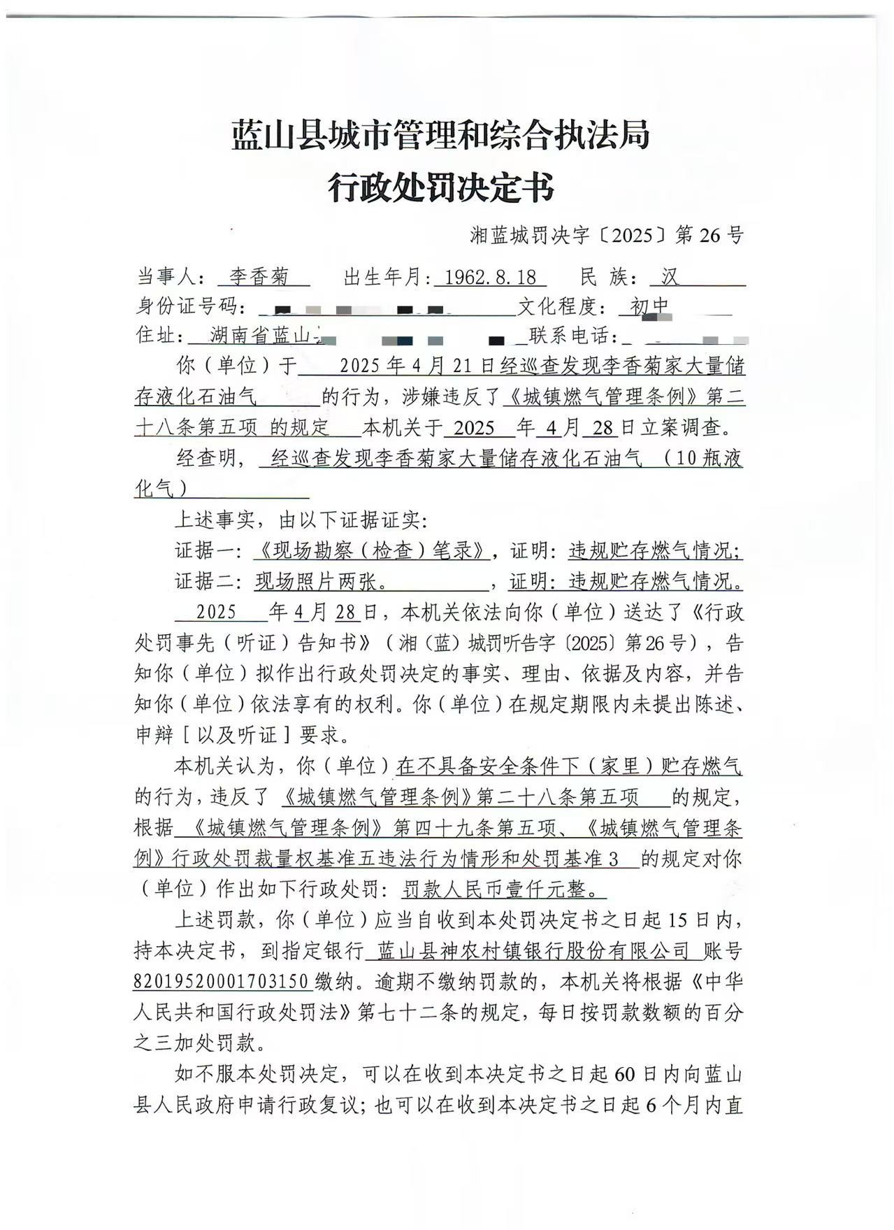关于对李香菊在不具备安全条件下(家里)贮存燃气行为的处罚