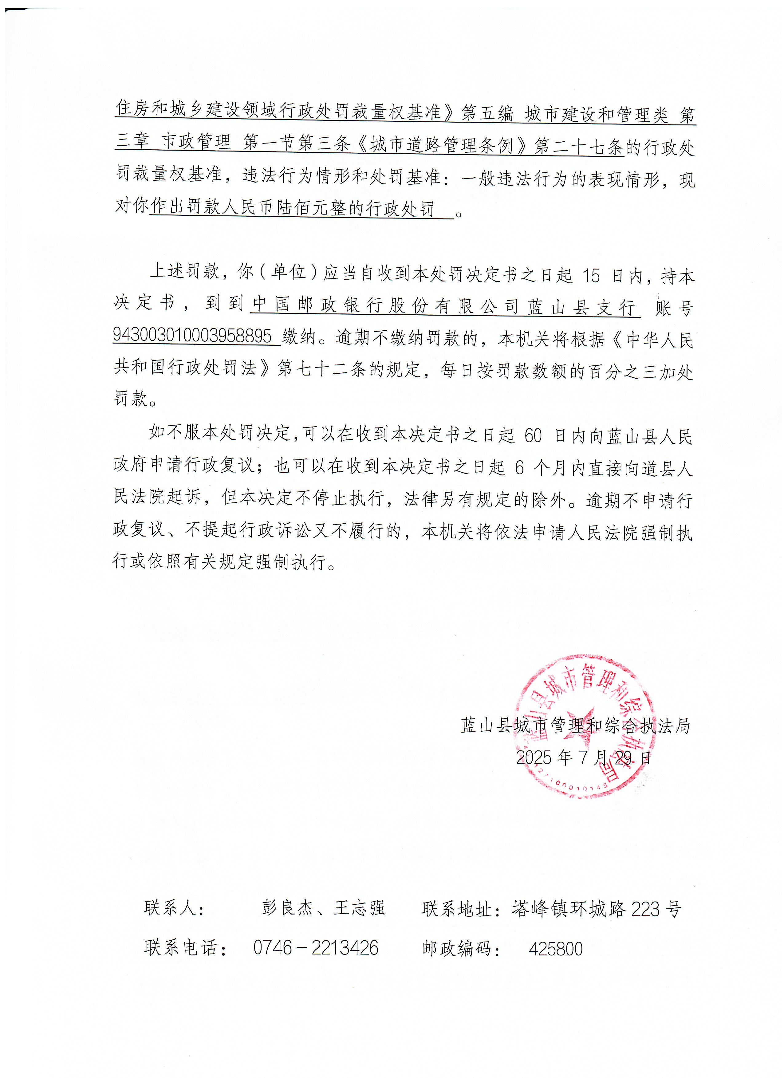 关于对陈春维在舜峰路113号人行道上未经批准擅自占用城市道路装修行为的处罚