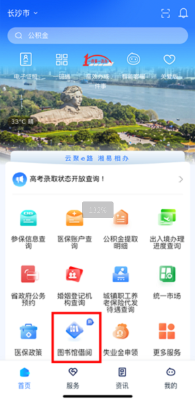 进入“湘易办”APP,在首页金刚区第二页,直接点击“图书馆借阅”功能,即可跳转至“湘阅通”微信小程序使用有关服务。