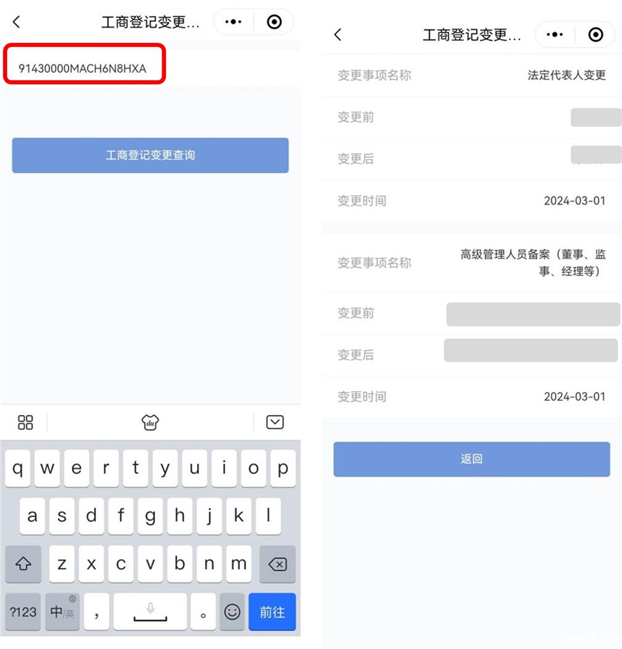 选择“工商登记变更”服务,输入企业统一社会信用代码,即可查询到企业的变更信息。包括变更事项名称、变更时间以及变更前后的信息。