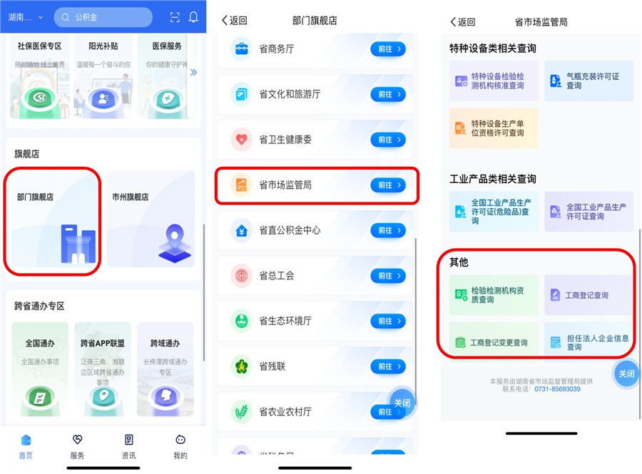 登录“湘易办”后,在首页“部门旗舰店”中选择“省市场监督管理局”,在“其他”栏目中点击对应服务名称即可进入;或在首页直接搜索相应服务名称进入。