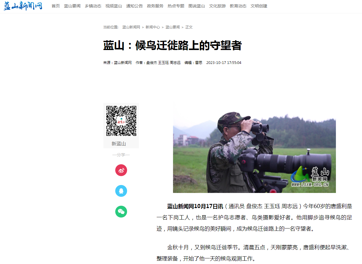 蓝山新闻网10月17日讯(通讯员 盘俊杰 王玉珏 周志远)今年60岁的唐盛利是一名下岗工人,也是一名护鸟志愿者、鸟类摄影爱好者。他用脚步追寻候鸟的足迹,用镜头记录候鸟的美好瞬间,成为候鸟迁徙路上的一名守望者。