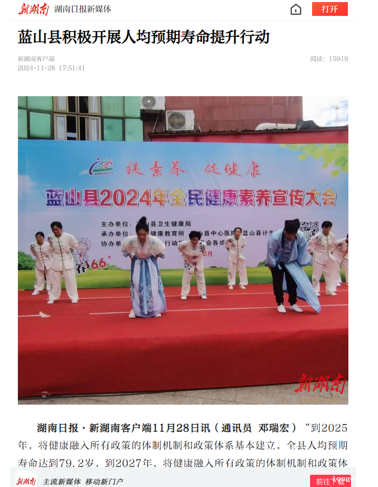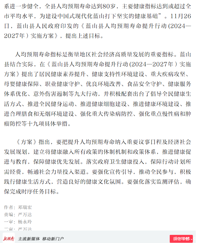 湖南日报·新湖南客户端11月28日讯(通讯员 邓瑞宏)“到2025年,将健康融入所有政策的体制机制和政策体系基本建立,全县人均预期寿命达到79.2岁,到2027年,将健康融入所有政策的体制机制和政策体系进一步健全,全县人均预期寿命达到80岁,主要健康指标达到或超过全市平均水平,为建设中国式现代化蓝山打下坚实的健康基础”。11月26日,hth最新登录入口印发的《华体会登陆网站人均预期寿命提升行动(2024—2027年)实施方案》,提出上述目标。