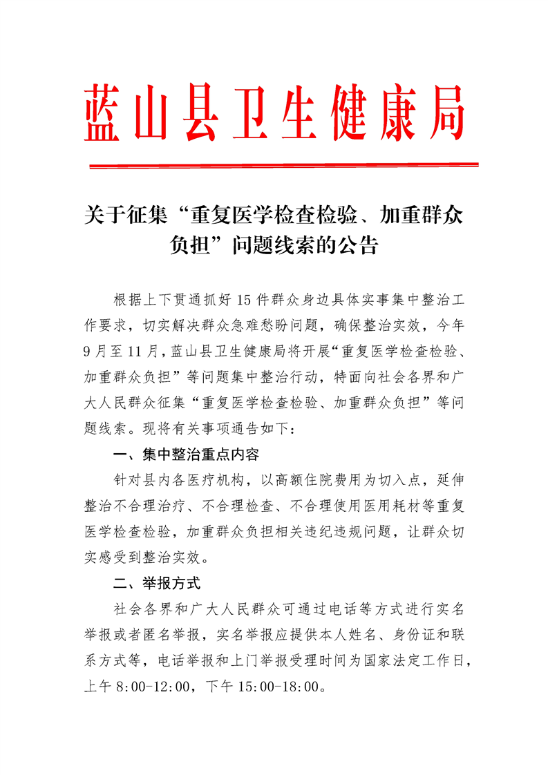 关于征集“重复医学检查检验、加重群众负担”问题线索的公告