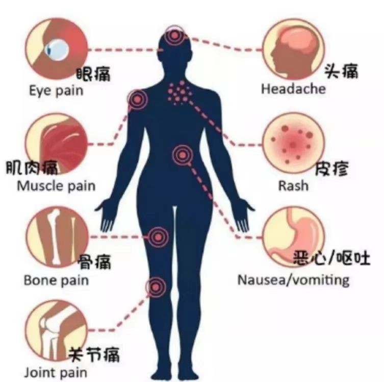 人感染病毒后,大多在5-9天发病。由于患者在发病时会有剧烈的肌肉关节疼痛,又被称为“断骨热”。