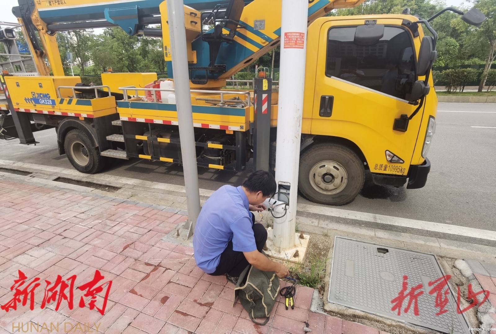 7月30日,在华体会登陆网站城区湘粤北路,华体会登陆网站城市管理和综合执法局路灯管理所的工作人员正在进行路灯维护作业,他们将路灯作业车停好后,摆放安全警示牌,疏导交通秩序,进行现场维修操作。经工作人员现场检查,发现路灯电缆线烧坏了,随即工作人员对电缆线进行了更换,路灯又亮了起来。这一盏路灯维修完成后,紧接着他们又进行下一盏路灯的维修。